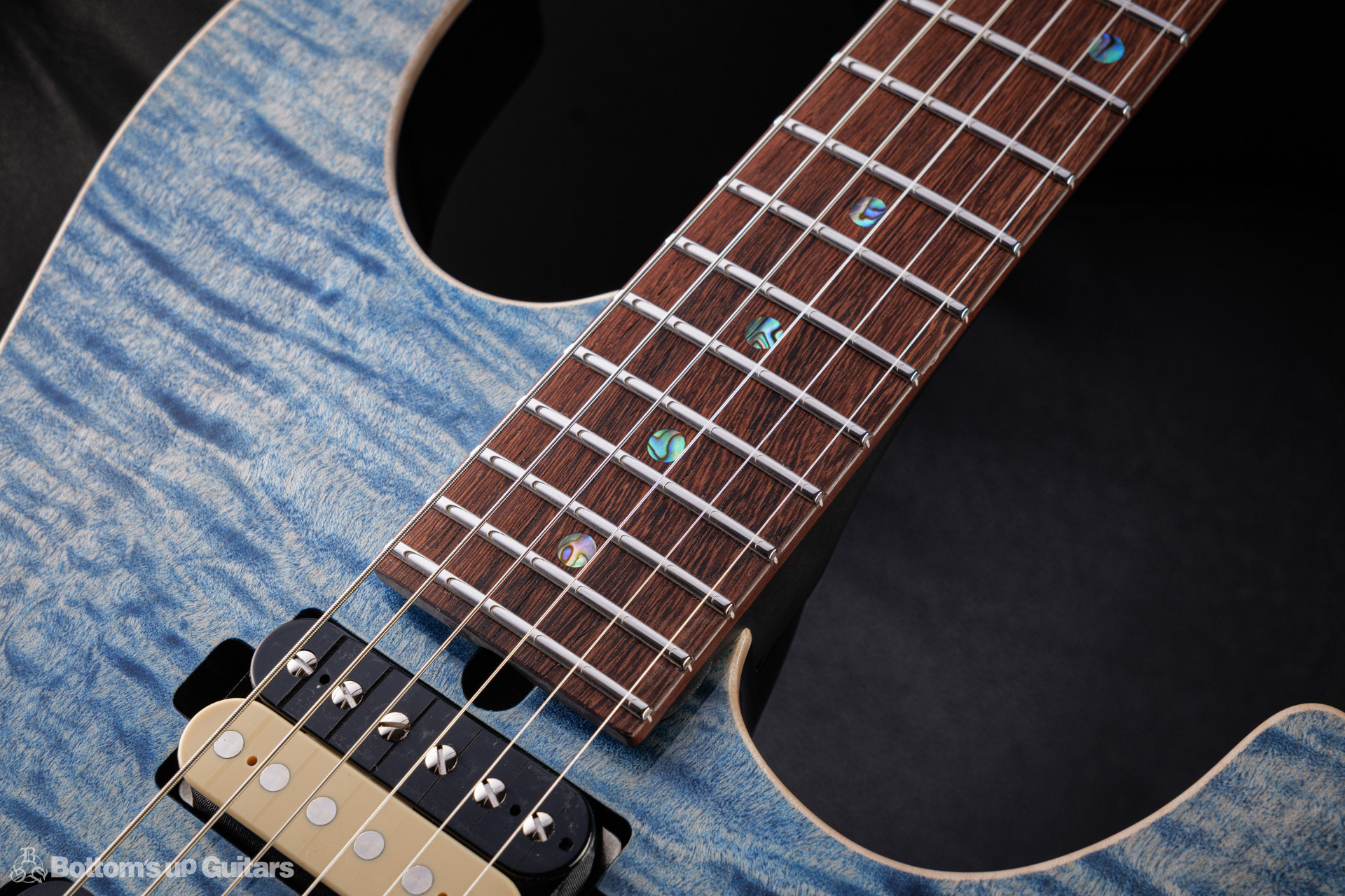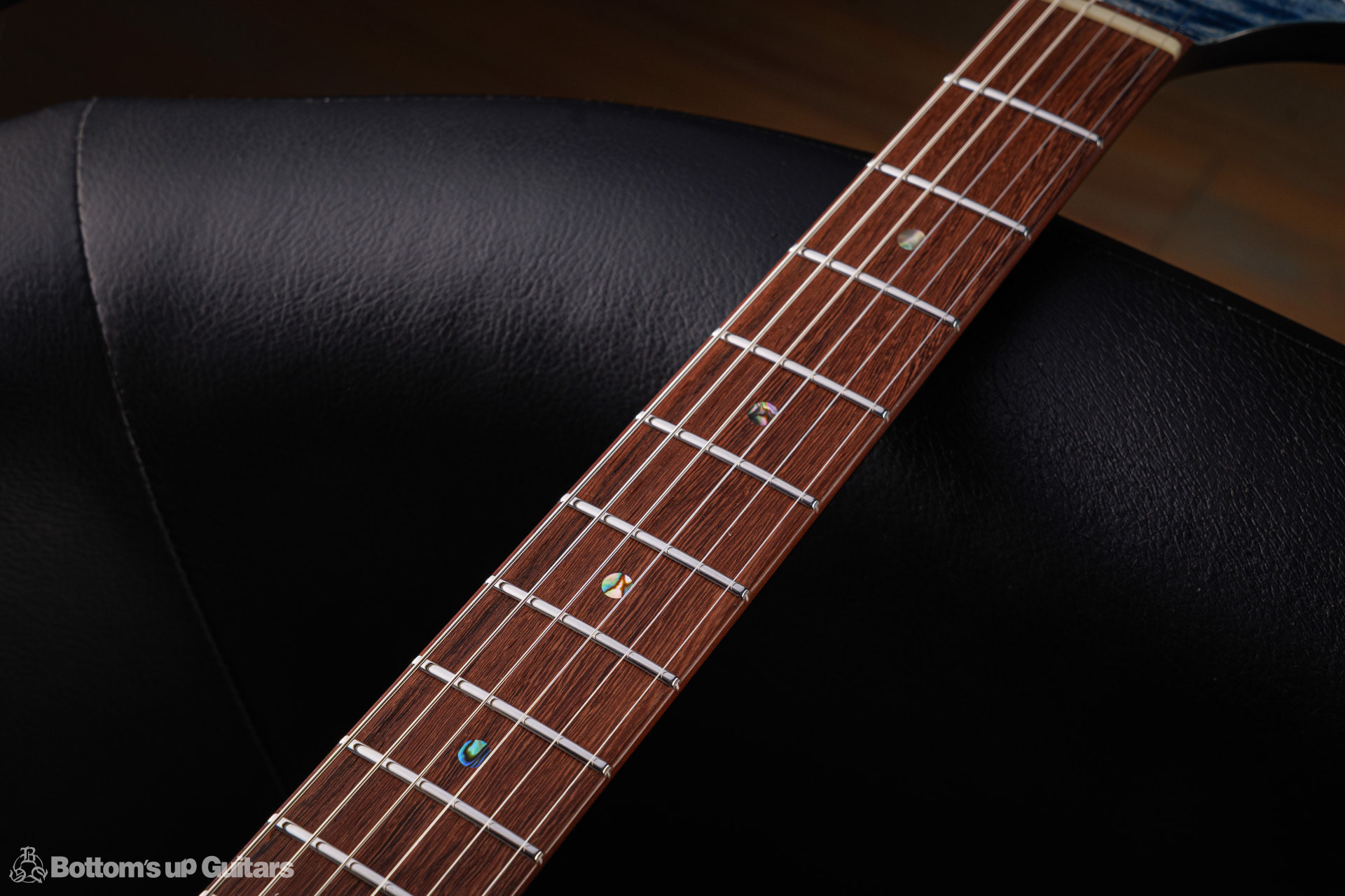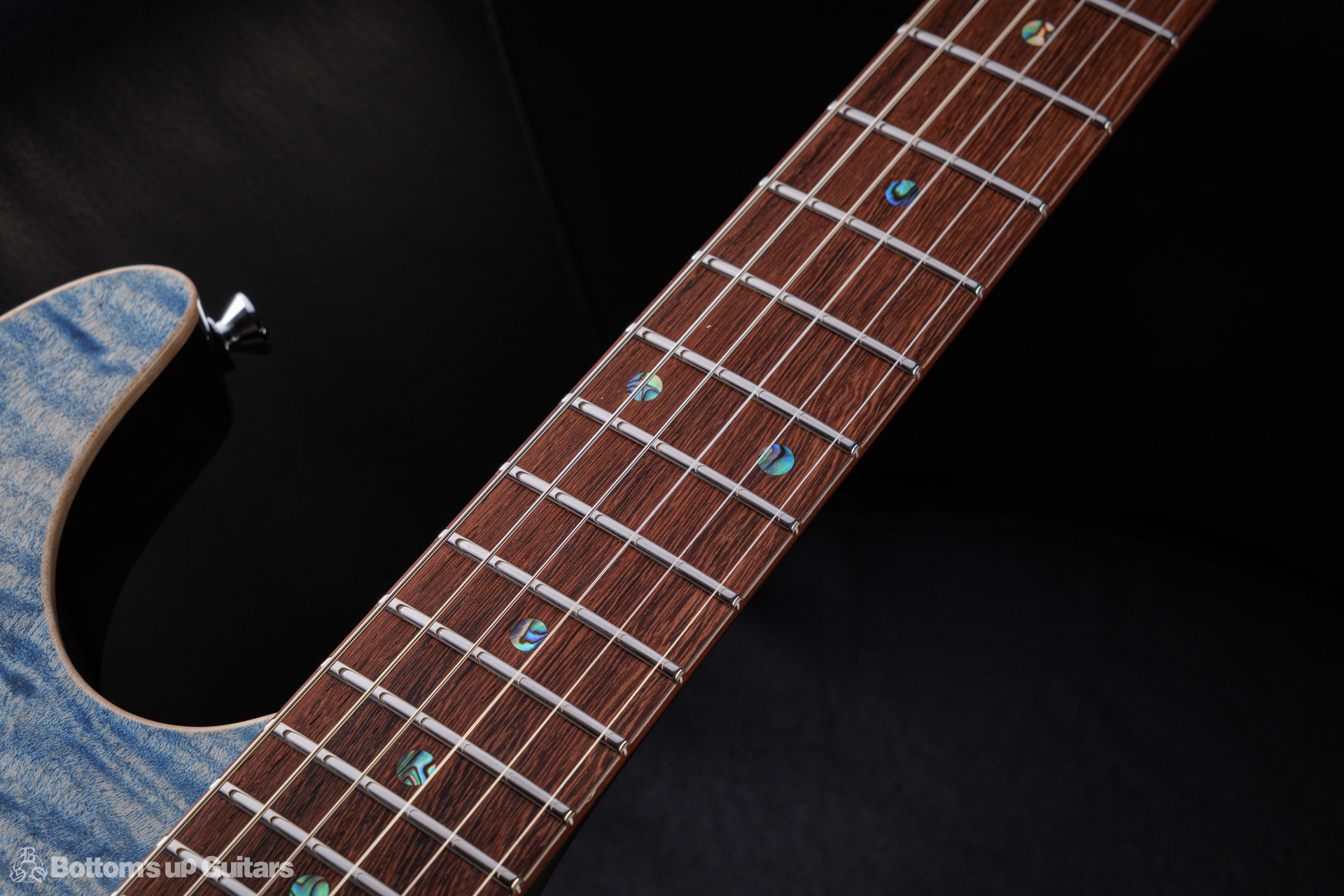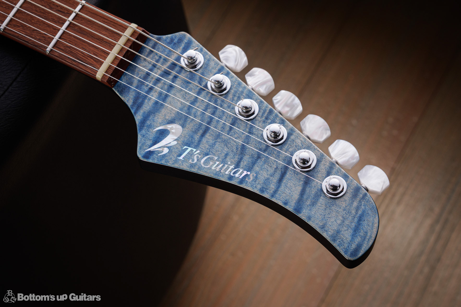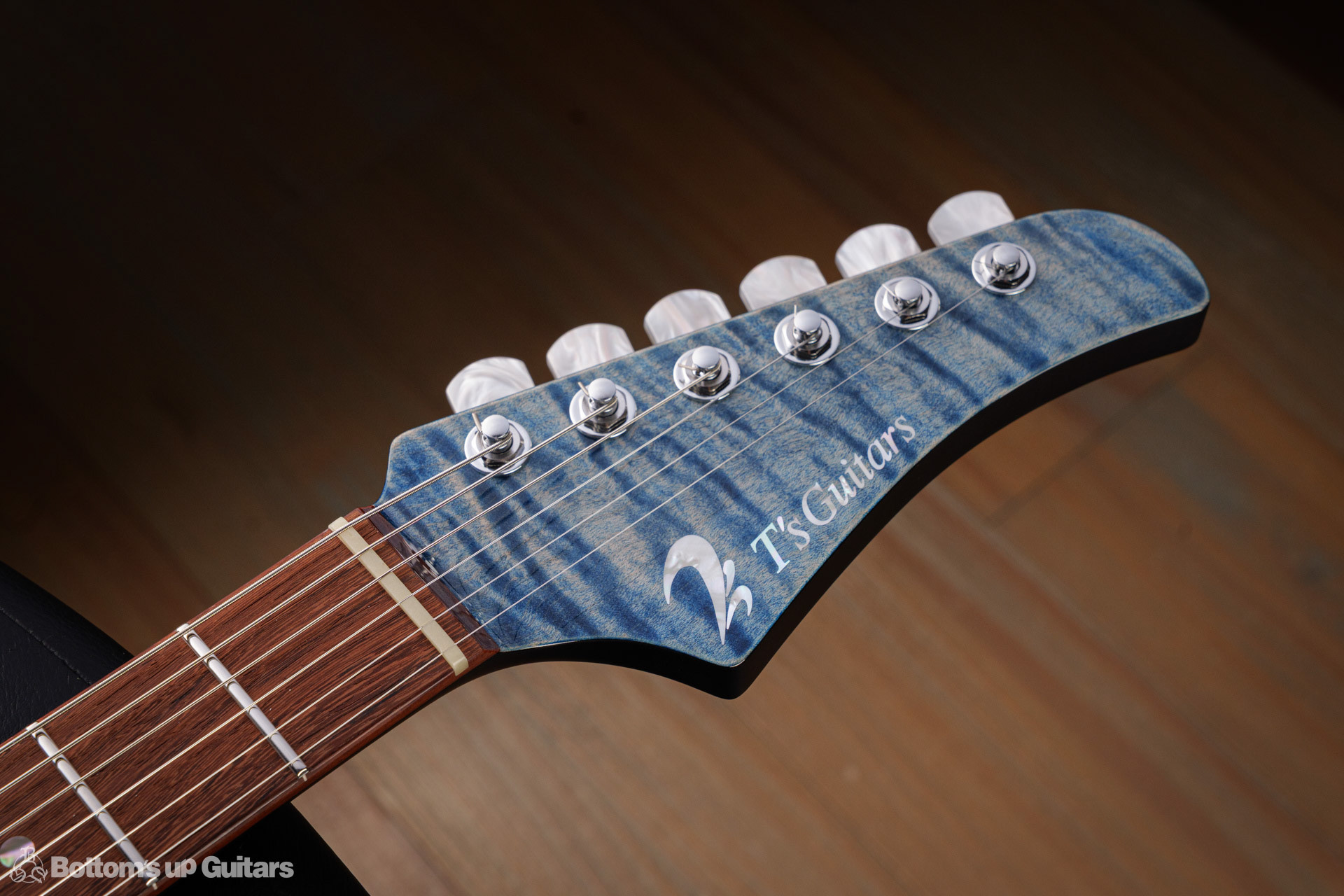 T's Guitars ( ティーズギター ) カスタムモデル - Trans Blue Denim Finish - フリーダム(F.C.G.R)社製のステンレスフレット、ルミンレイ(強蓄光)のサイドドットポジションマークを採用し、ジョイントプレートを排したラウンドヒール加工。 ⇒ プロの現場でも即活躍できて、永く良いコンディションで弾き続けて頂けるように致しました。 バックパネルが透けていたり、ボディエンド側のエンドピンを2個つけていたりする点もB.U.G.ならではのこだわりです。