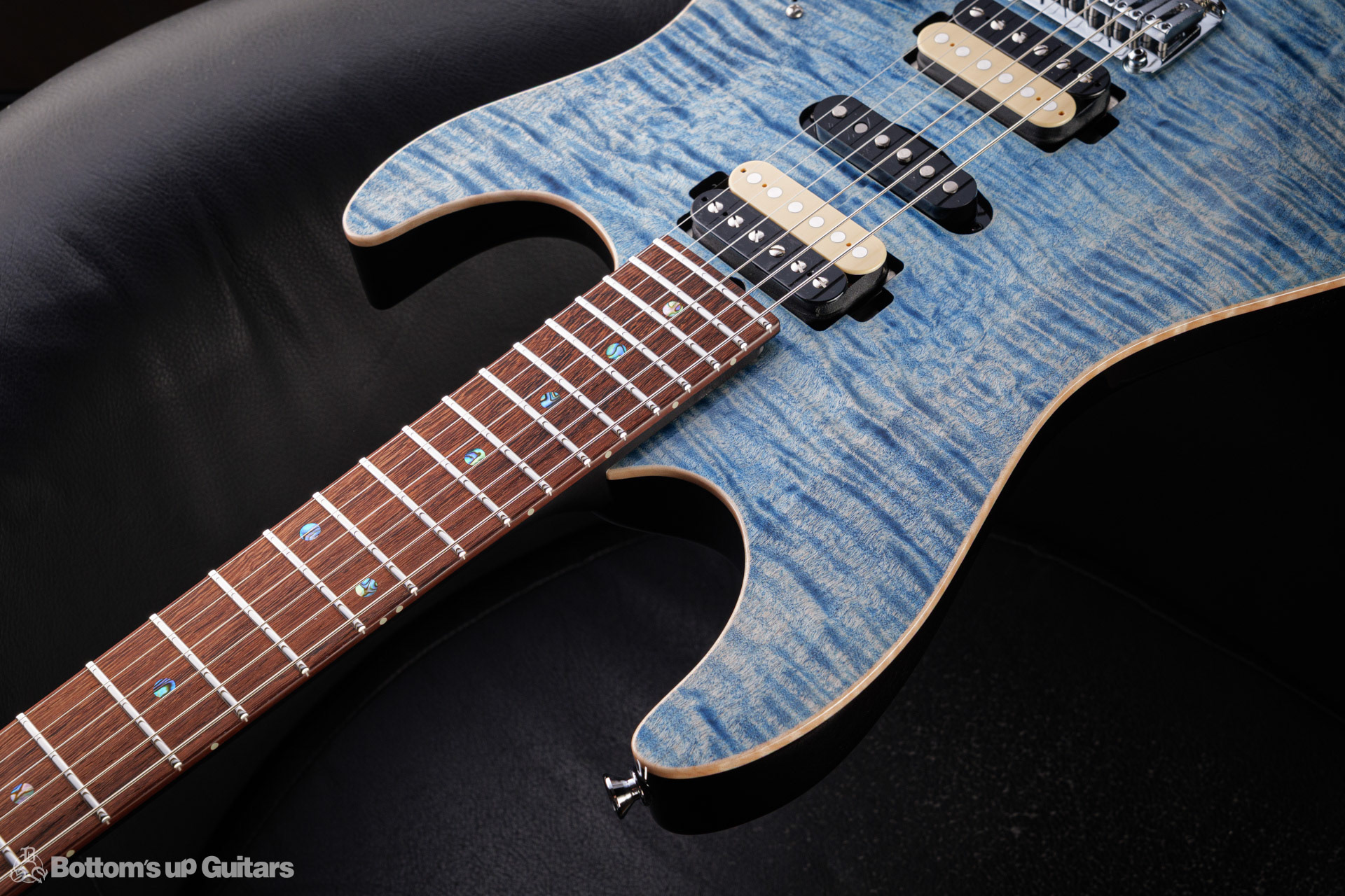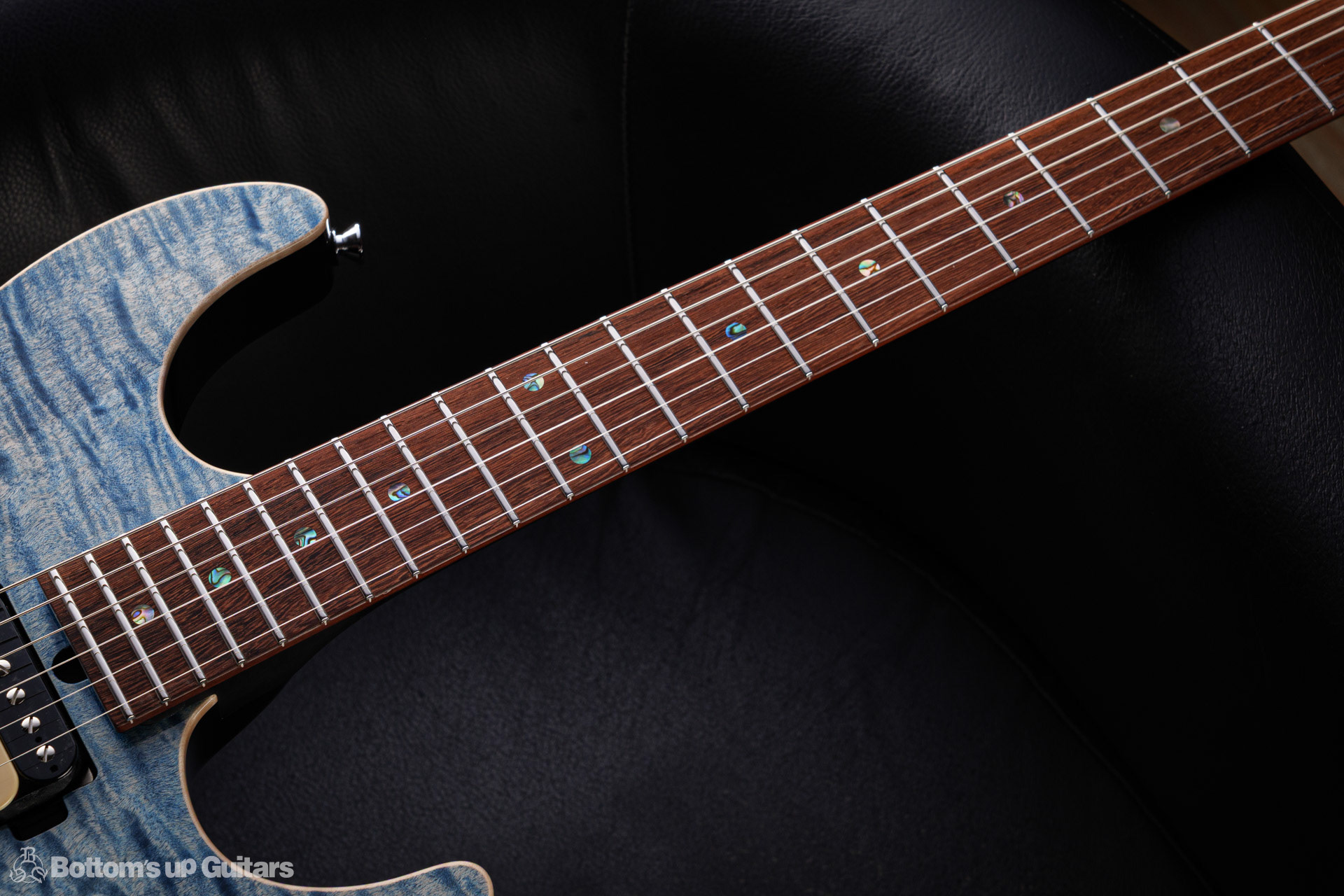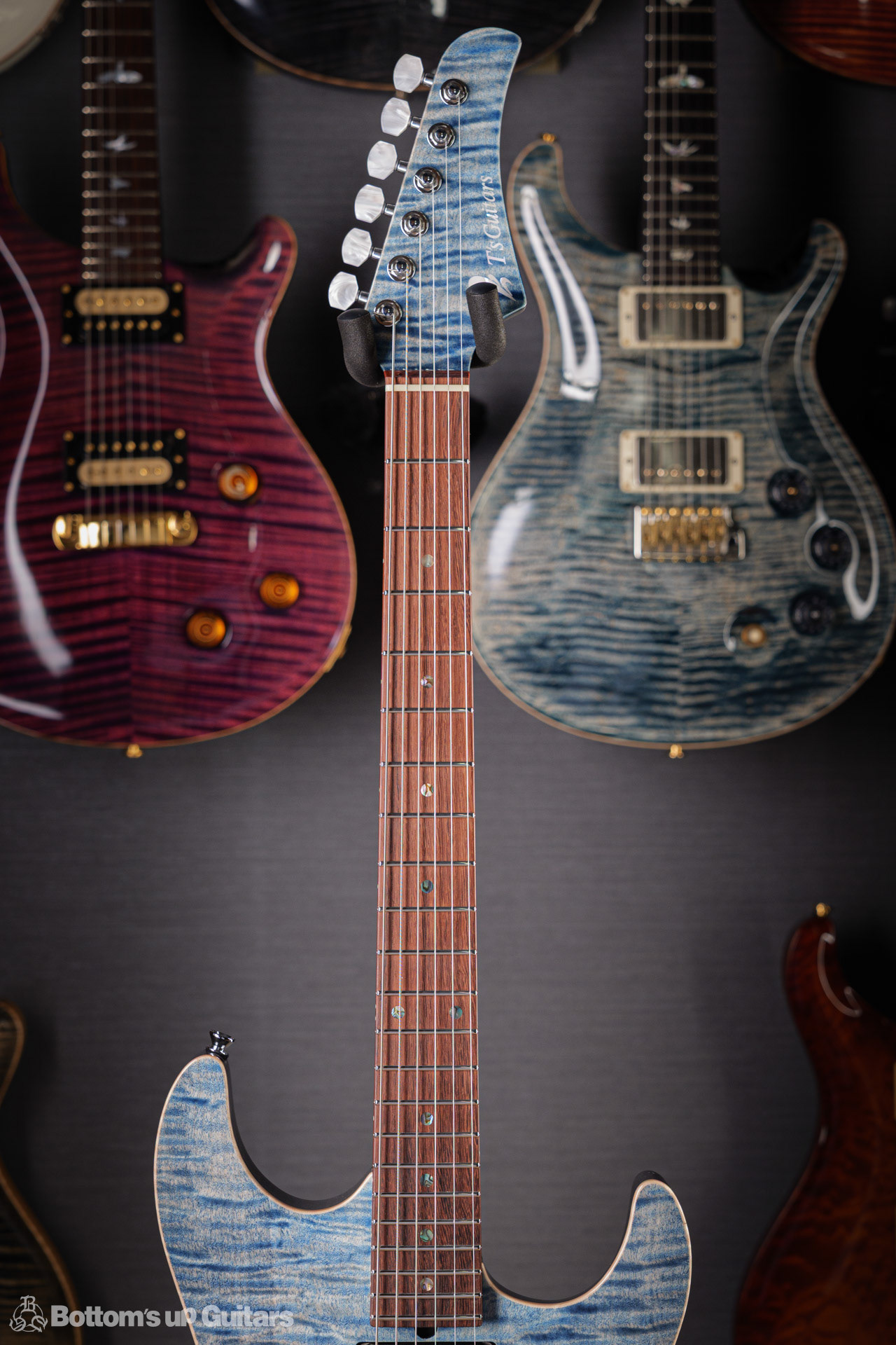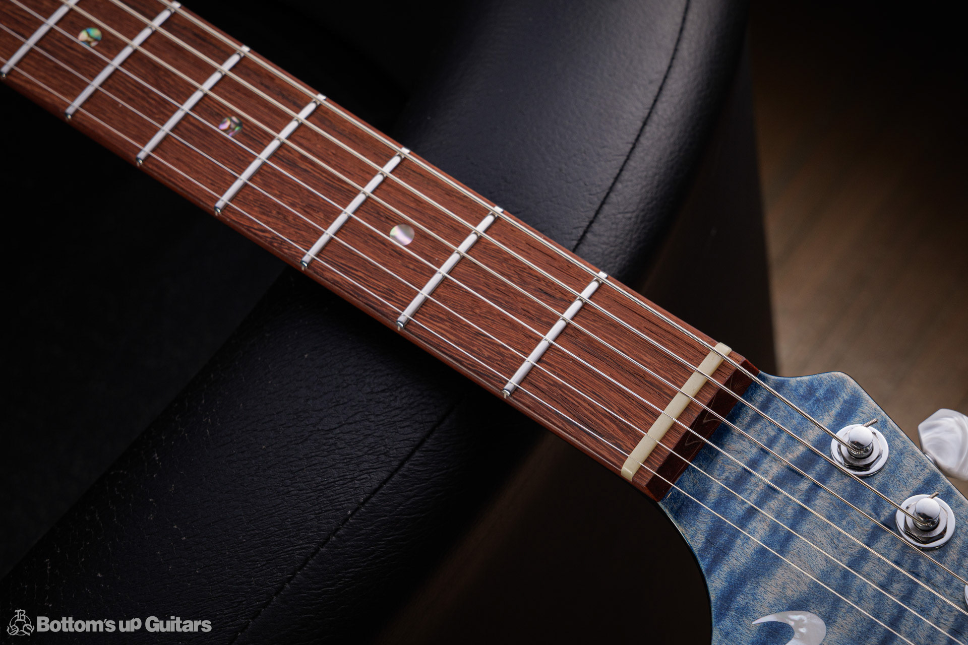 T's Guitars ( ティーズギター ) カスタムモデル - Trans Blue Denim Finish - フリーダム(F.C.G.R)社製のステンレスフレット、ルミンレイ(強蓄光)のサイドドットポジションマークを採用し、ジョイントプレートを排したラウンドヒール加工。 ⇒ プロの現場でも即活躍できて、永く良いコンディションで弾き続けて頂けるように致しました。 バックパネルが透けていたり、ボディエンド側のエンドピンを2個つけていたりする点もB.U.G.ならではのこだわりです。