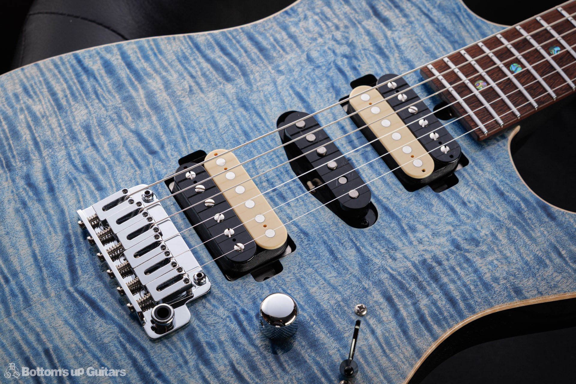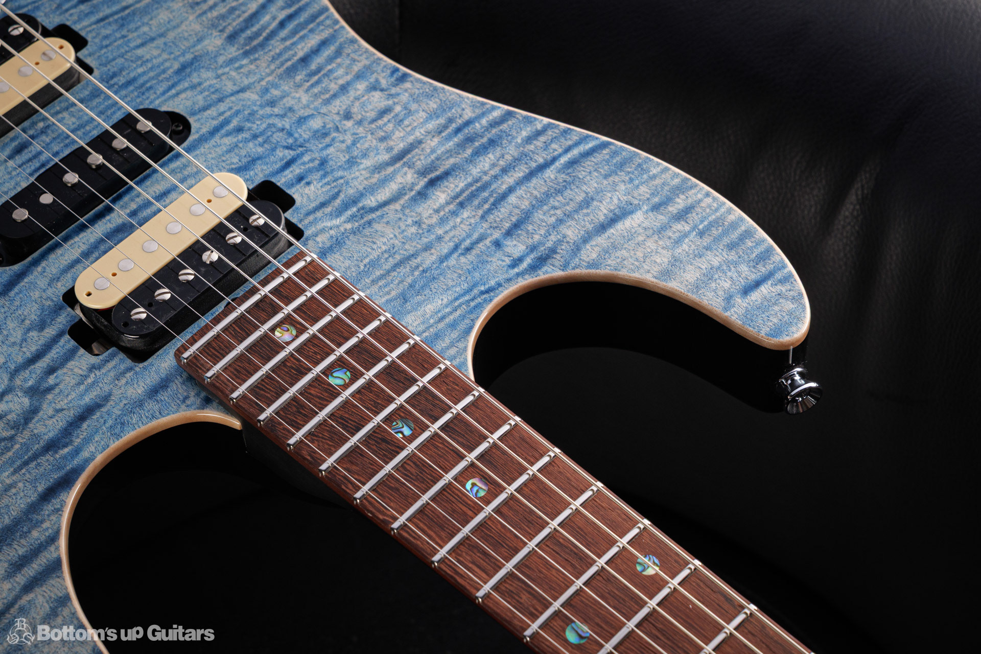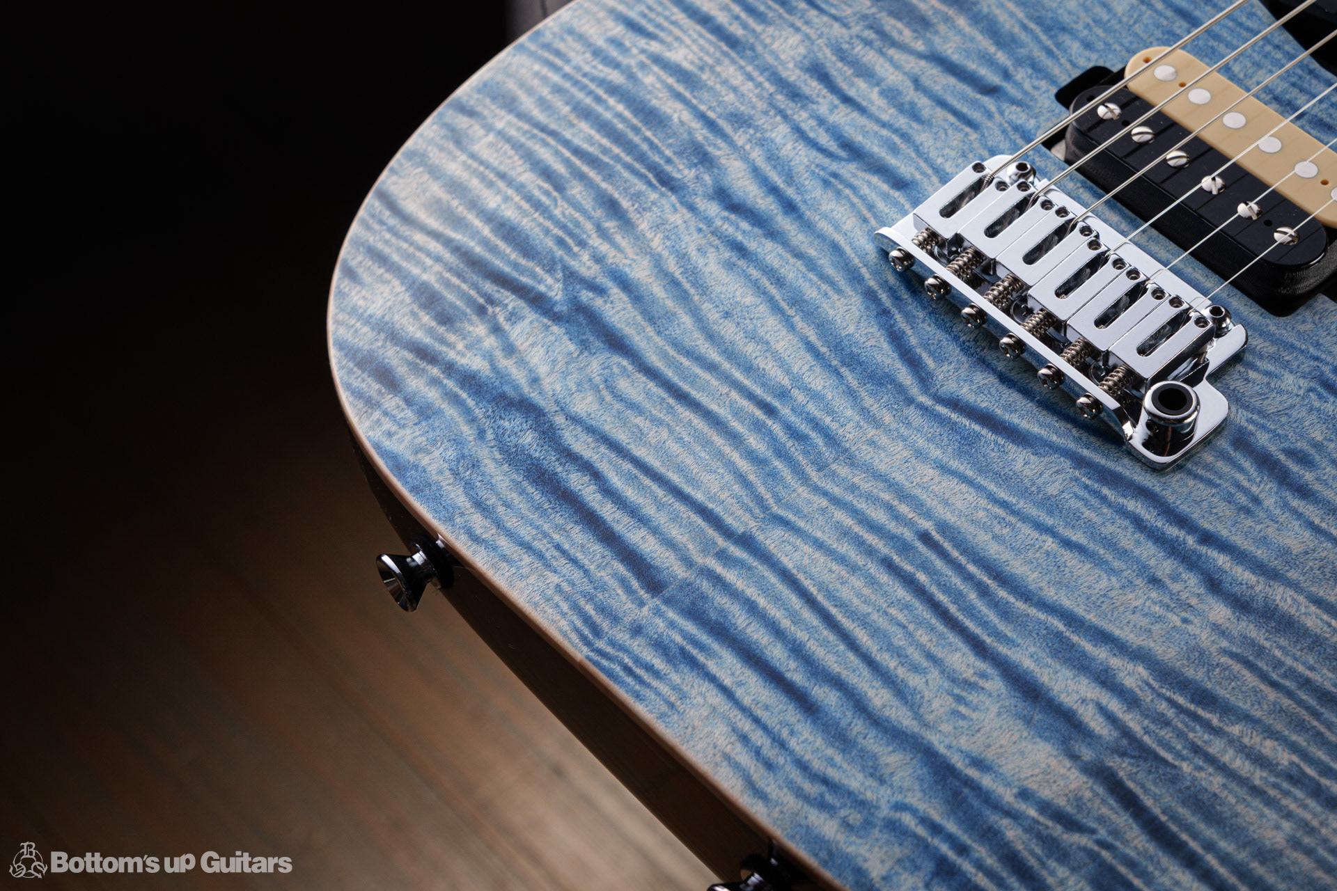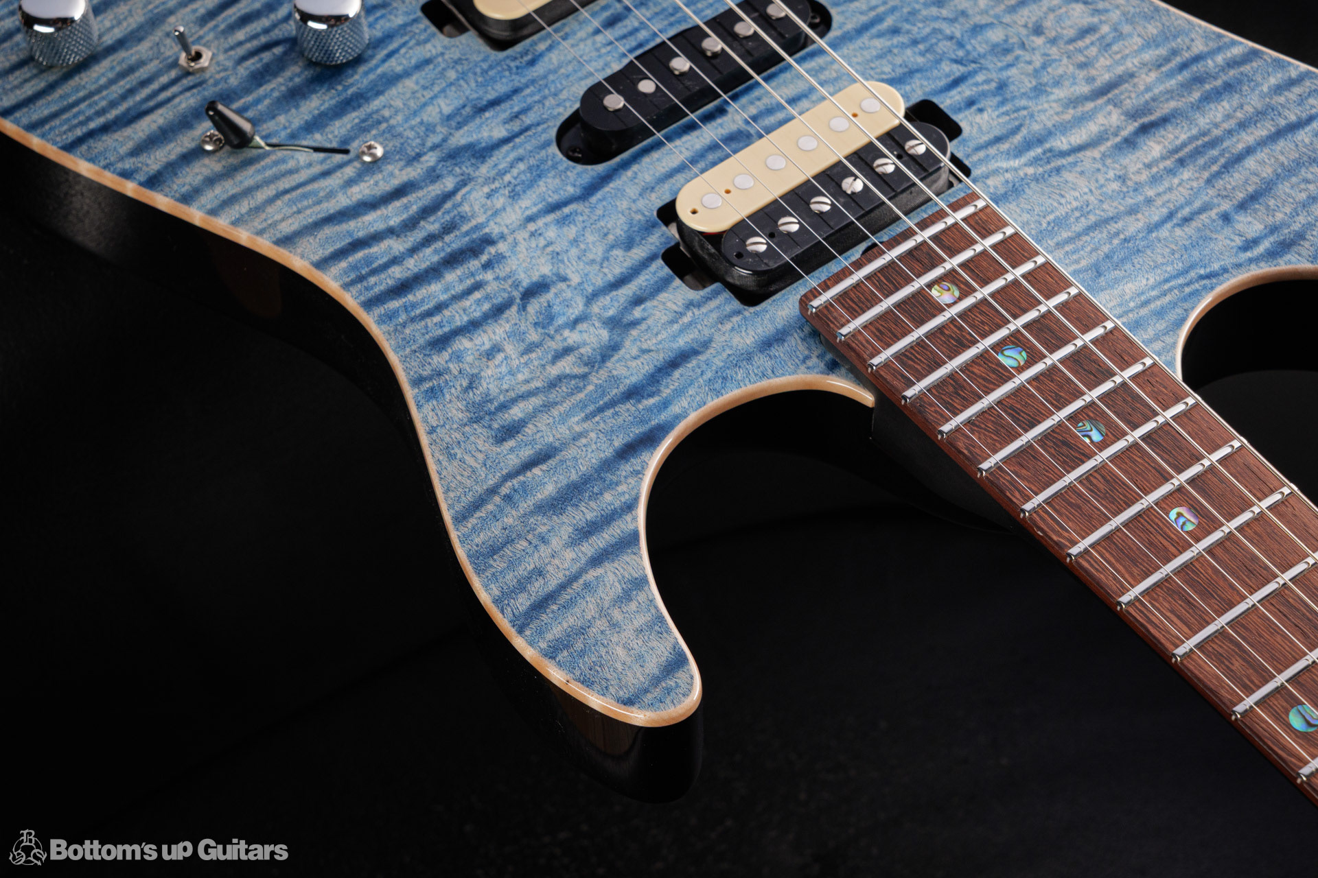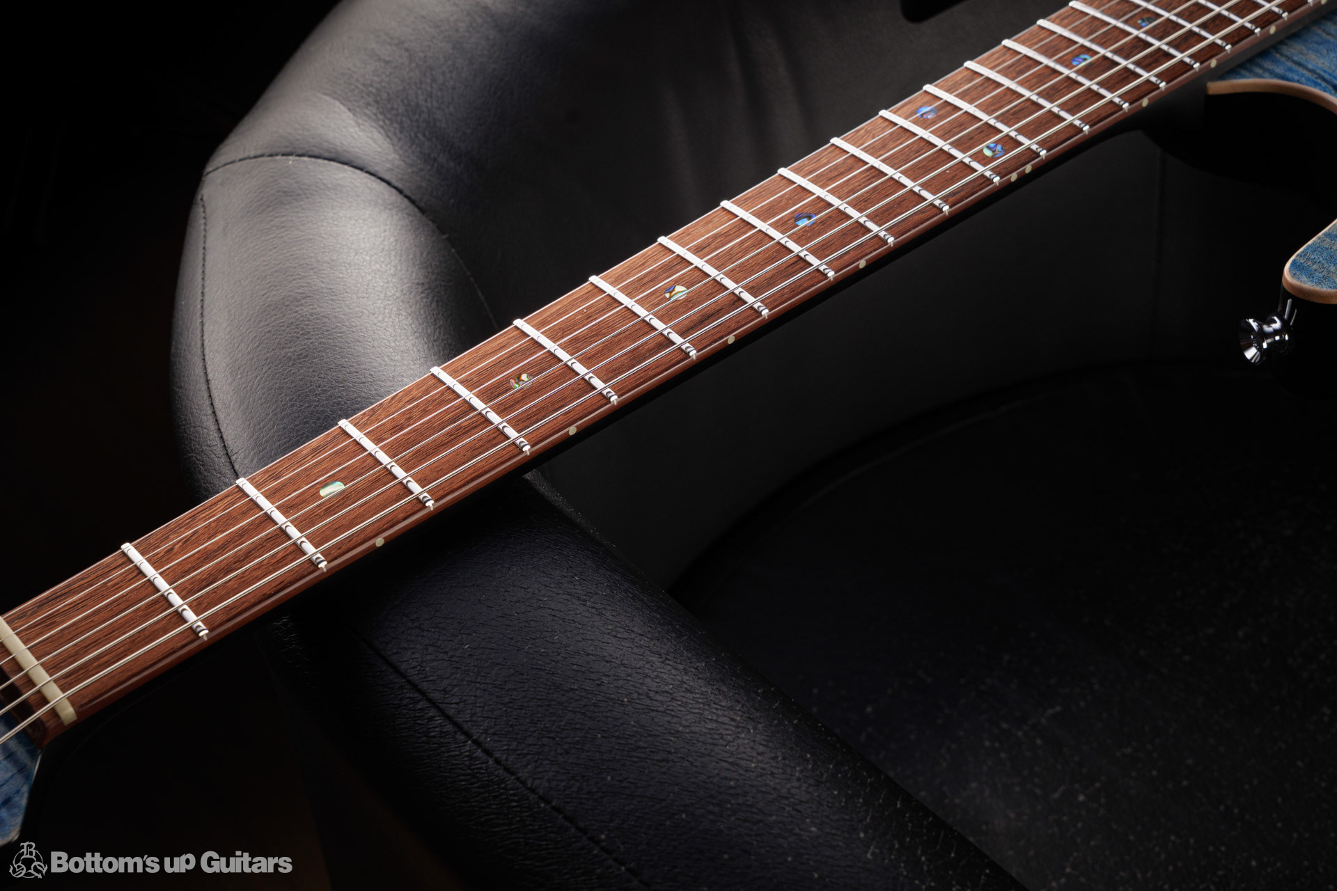 T's Guitars ( ティーズギター ) カスタムモデル - Trans Blue Denim Finish - フリーダム(F.C.G.R)社製のステンレスフレット、ルミンレイ(強蓄光)のサイドドットポジションマークを採用し、ジョイントプレートを排したラウンドヒール加工。 ⇒ プロの現場でも即活躍できて、永く良いコンディションで弾き続けて頂けるように致しました。 バックパネルが透けていたり、ボディエンド側のエンドピンを2個つけていたりする点もB.U.G.ならではのこだわりです。