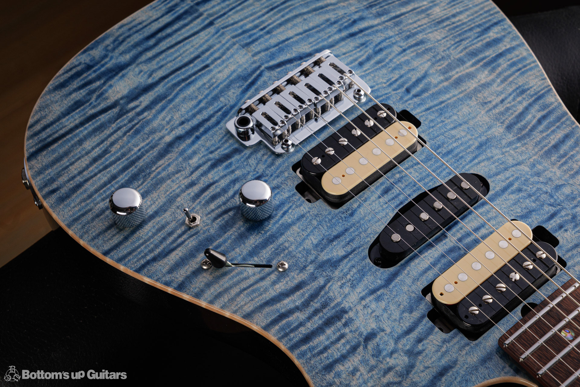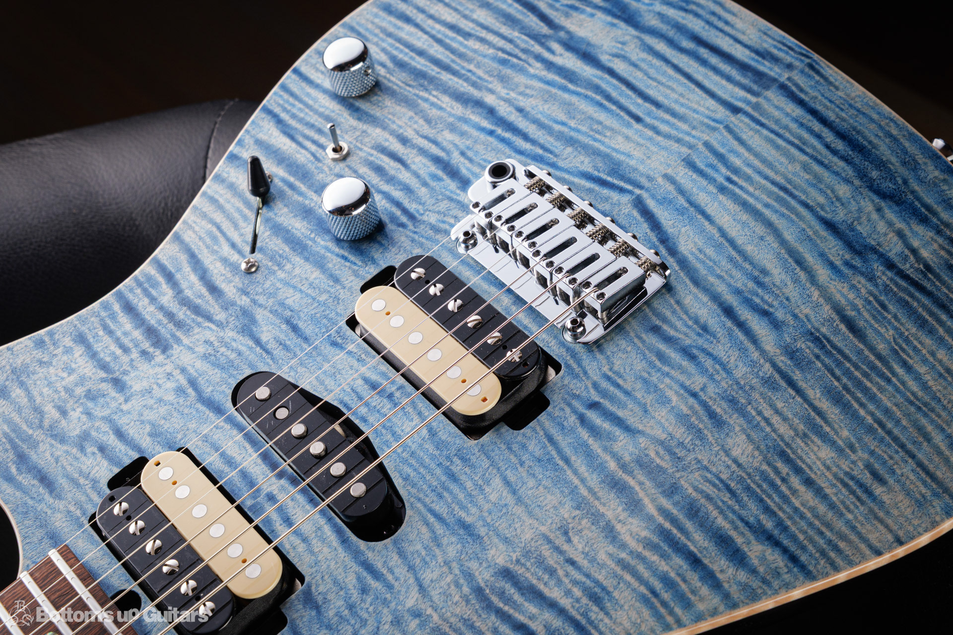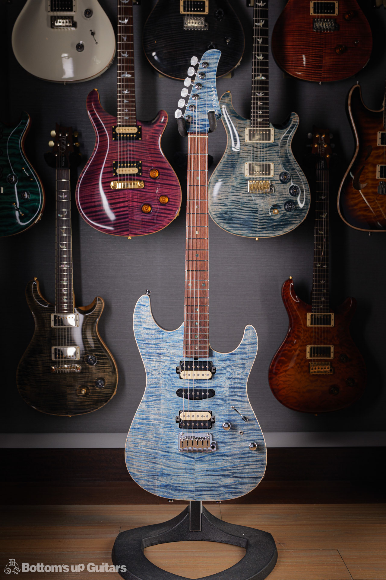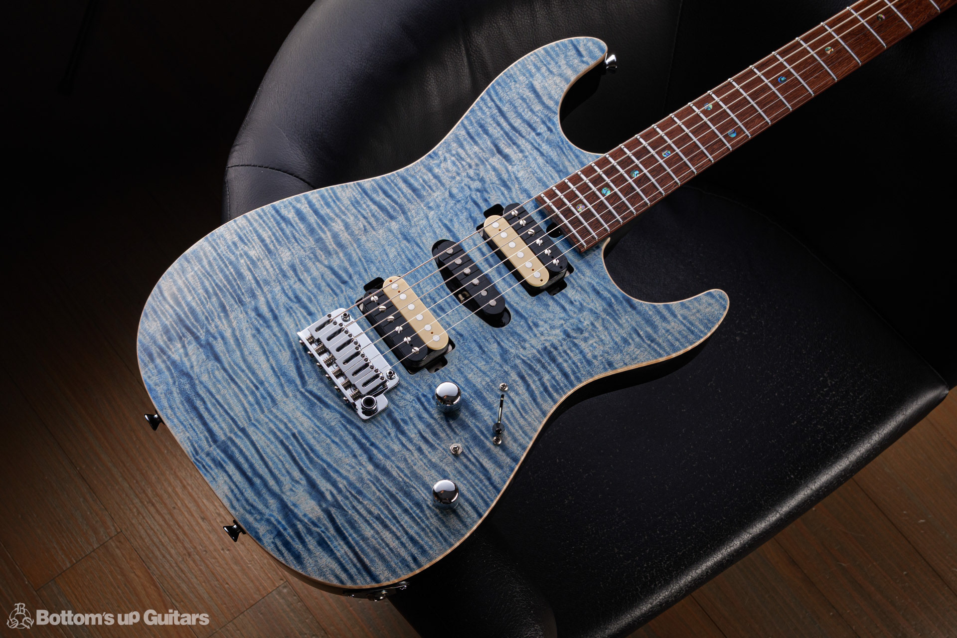 T's Guitars ( ティーズギター ) カスタムモデル - Trans Blue Denim Finish - フリーダム(F.C.G.R)社製のステンレスフレット、ルミンレイ(強蓄光)のサイドドットポジションマークを採用し、ジョイントプレートを排したラウンドヒール加工。 ⇒ プロの現場でも即活躍できて、永く良いコンディションで弾き続けて頂けるように致しました。 バックパネルが透けていたり、ボディエンド側のエンドピンを2個つけていたりする点もB.U.G.ならではのこだわりです。