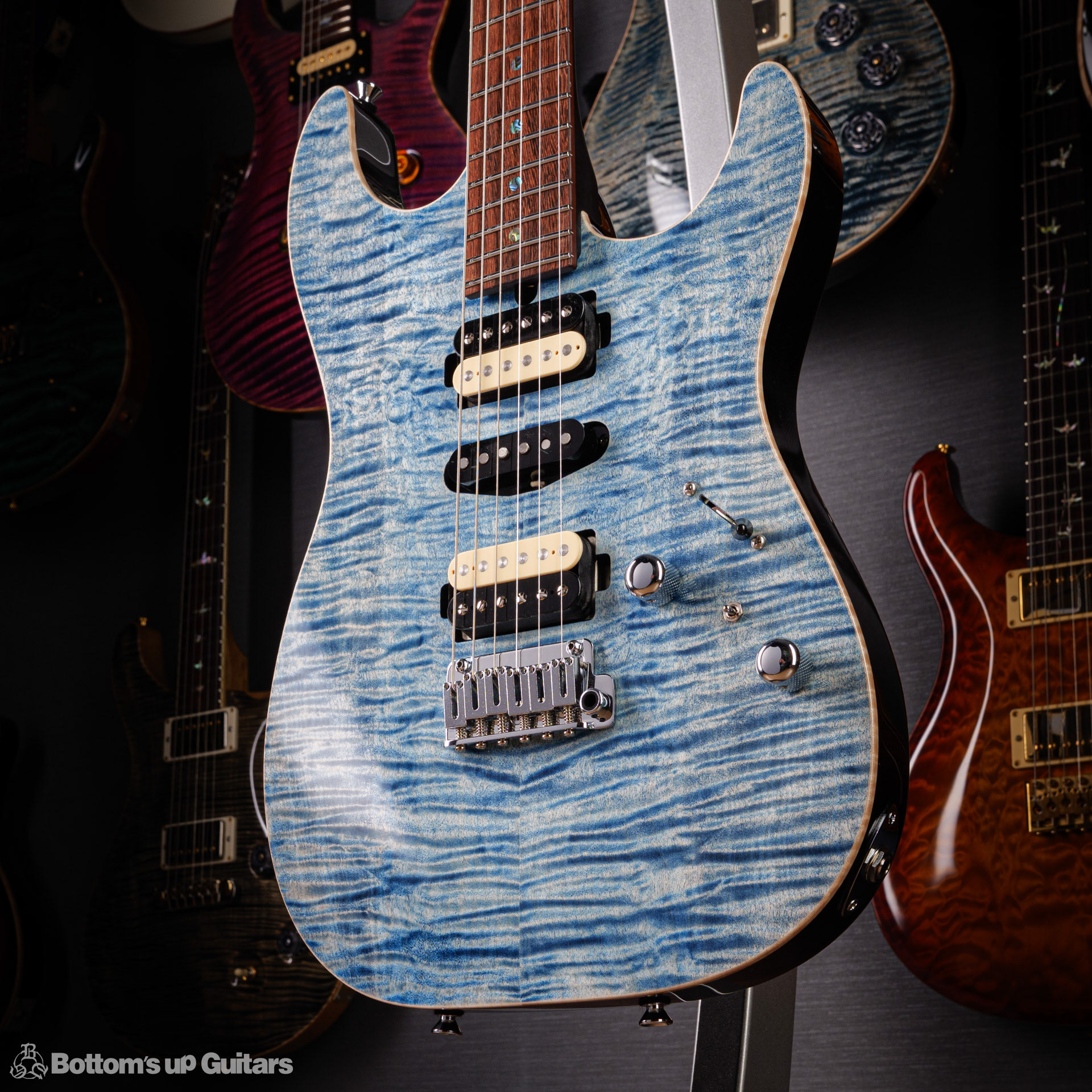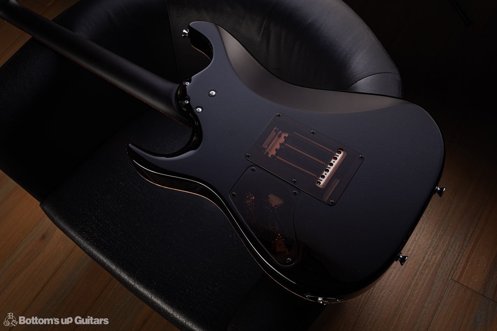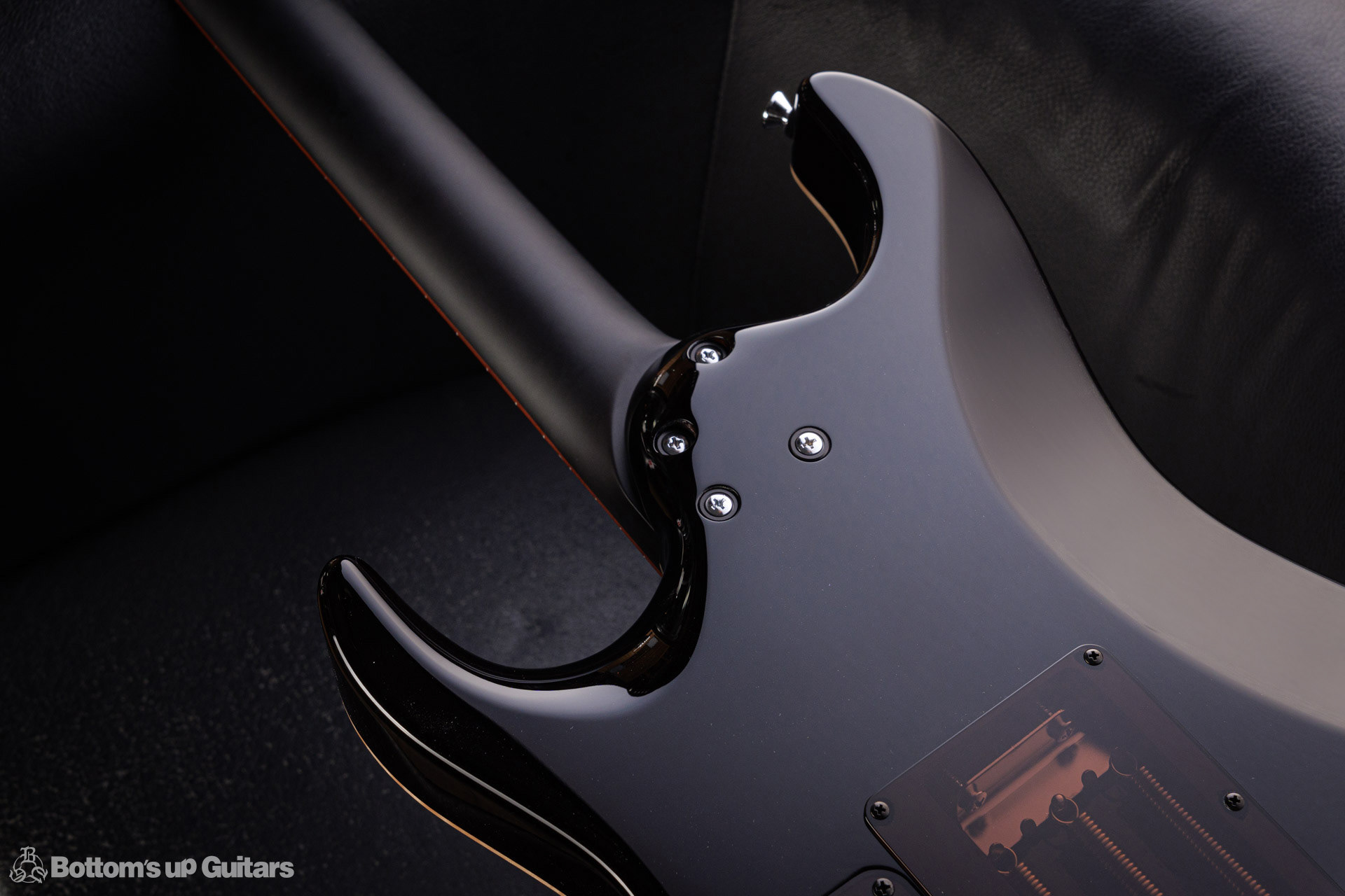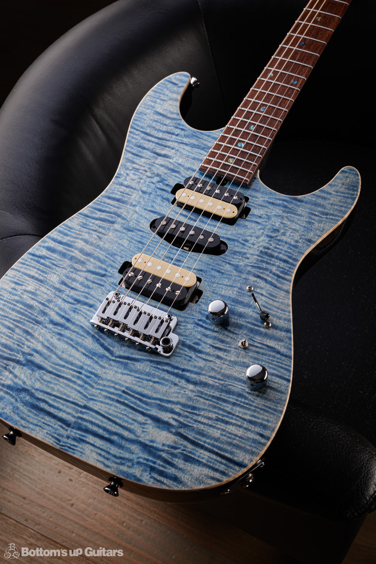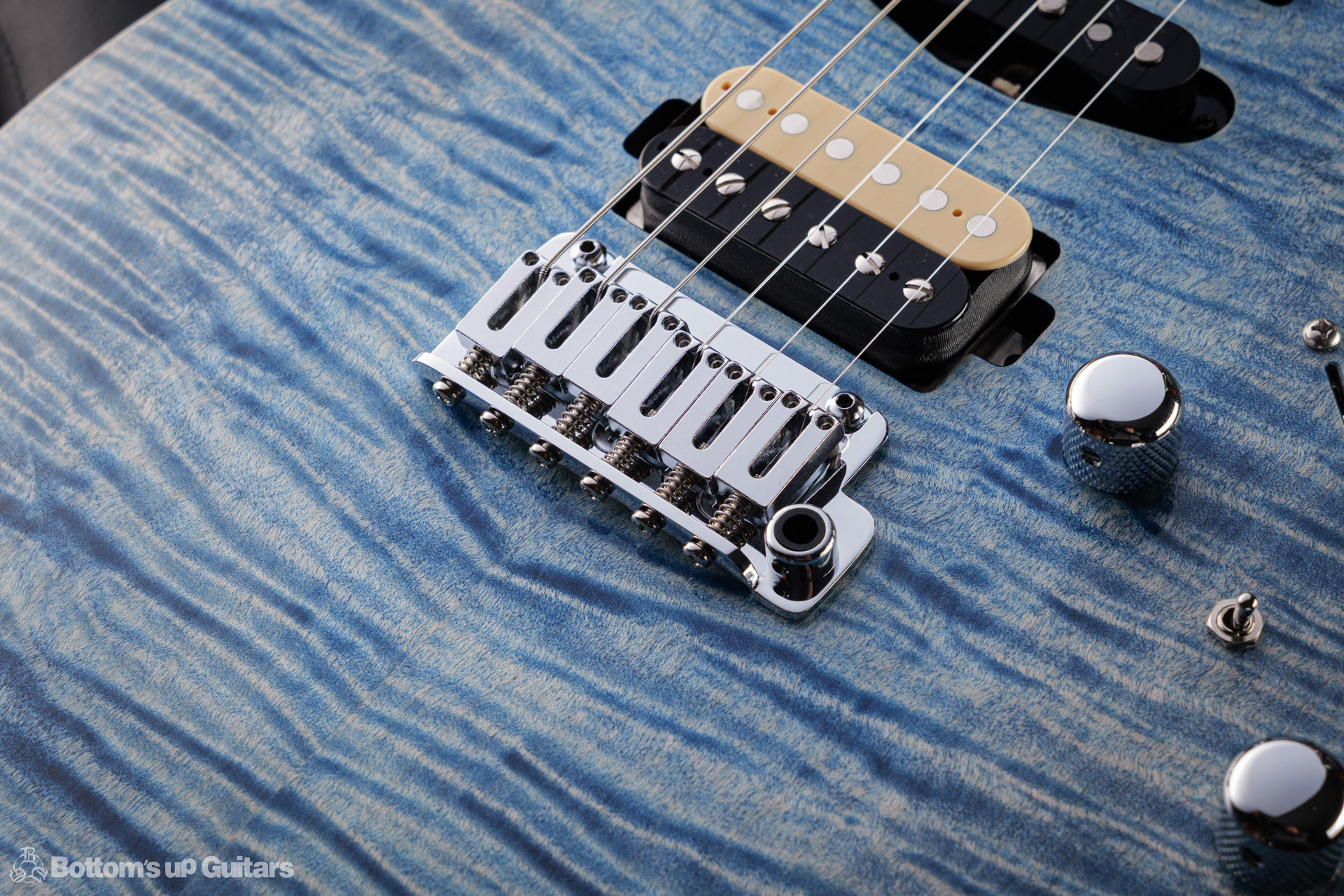 T's Guitars ( ティーズギター ) カスタムモデル - Trans Blue Denim Finish - フリーダム(F.C.G.R)社製のステンレスフレット、ルミンレイ(強蓄光)のサイドドットポジションマークを採用し、ジョイントプレートを排したラウンドヒール加工。 ⇒ プロの現場でも即活躍できて、永く良いコンディションで弾き続けて頂けるように致しました。 バックパネルが透けていたり、ボディエンド側のエンドピンを2個つけていたりする点もB.U.G.ならではのこだわりです。