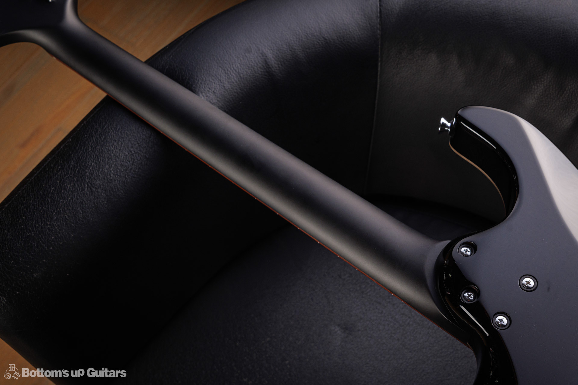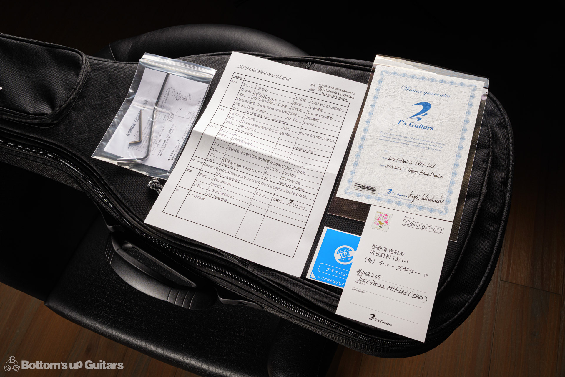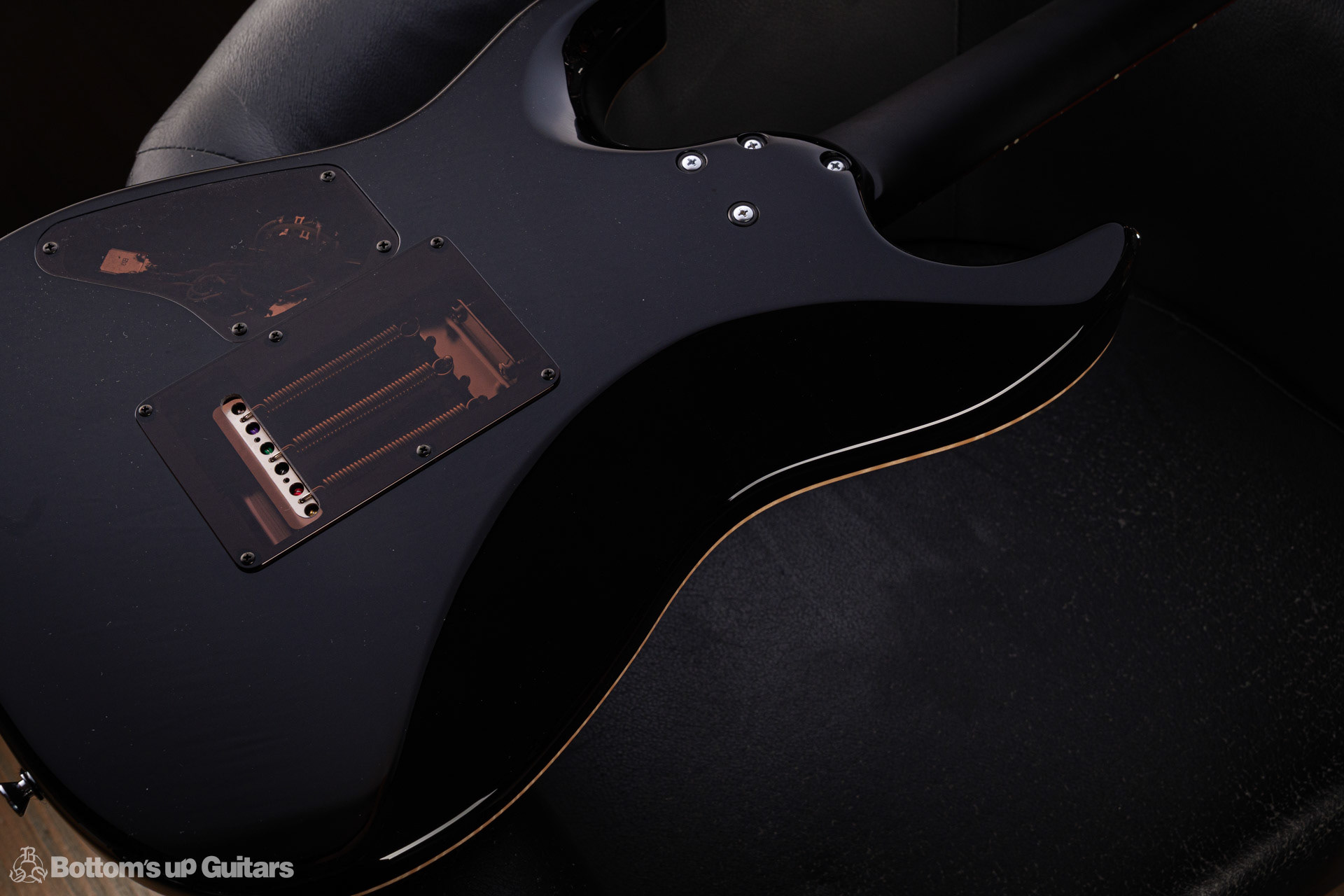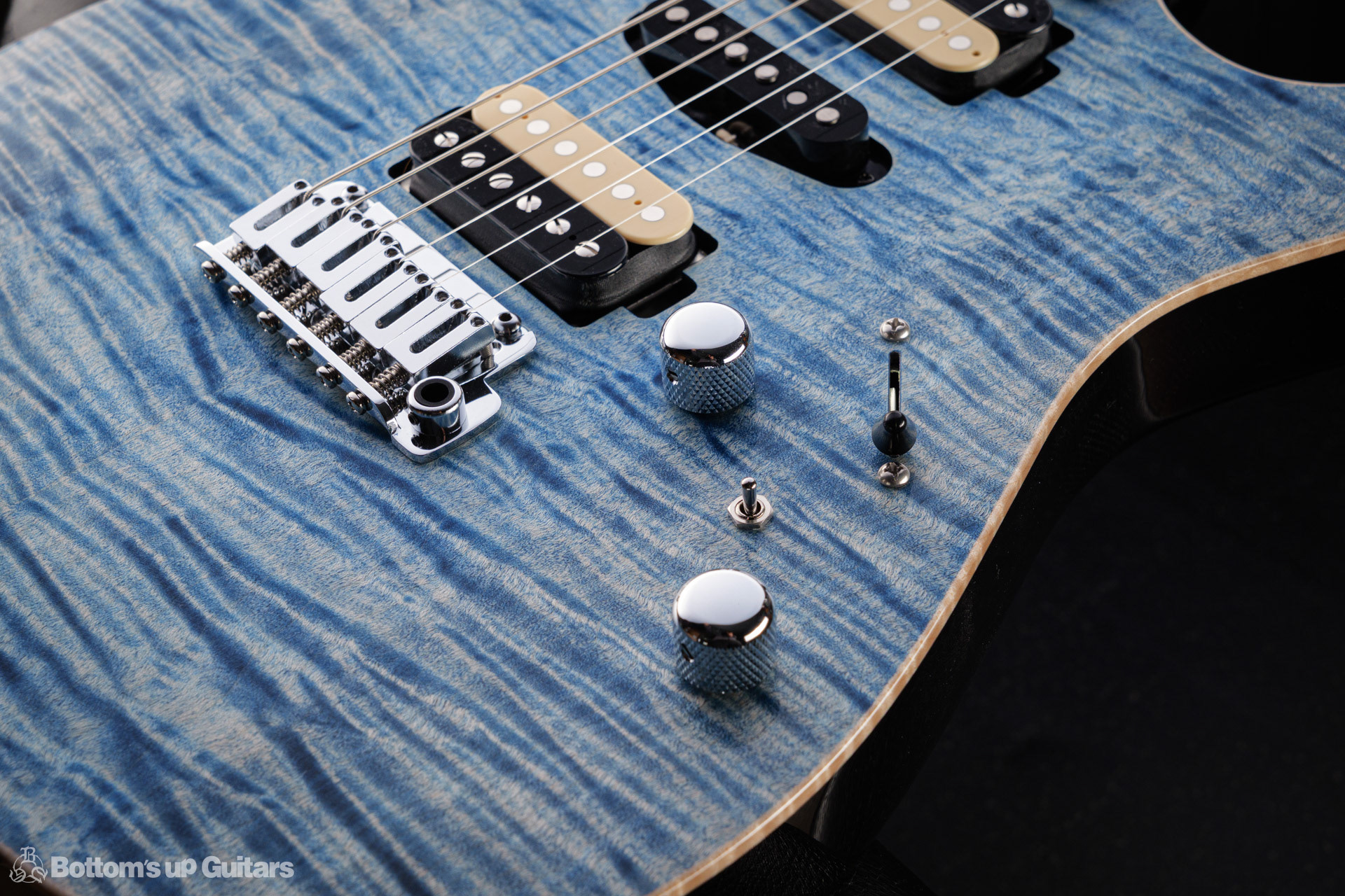 T's Guitars ( ティーズギター ) カスタムモデル - Trans Blue Denim Finish - フリーダム(F.C.G.R)社製のステンレスフレット、ルミンレイ(強蓄光)のサイドドットポジションマークを採用し、ジョイントプレートを排したラウンドヒール加工。 ⇒ プロの現場でも即活躍できて、永く良いコンディションで弾き続けて頂けるように致しました。 バックパネルが透けていたり、ボディエンド側のエンドピンを2個つけていたりする点もB.U.G.ならではのこだわりです。
