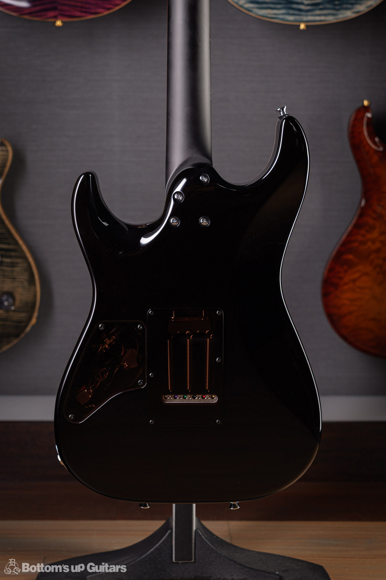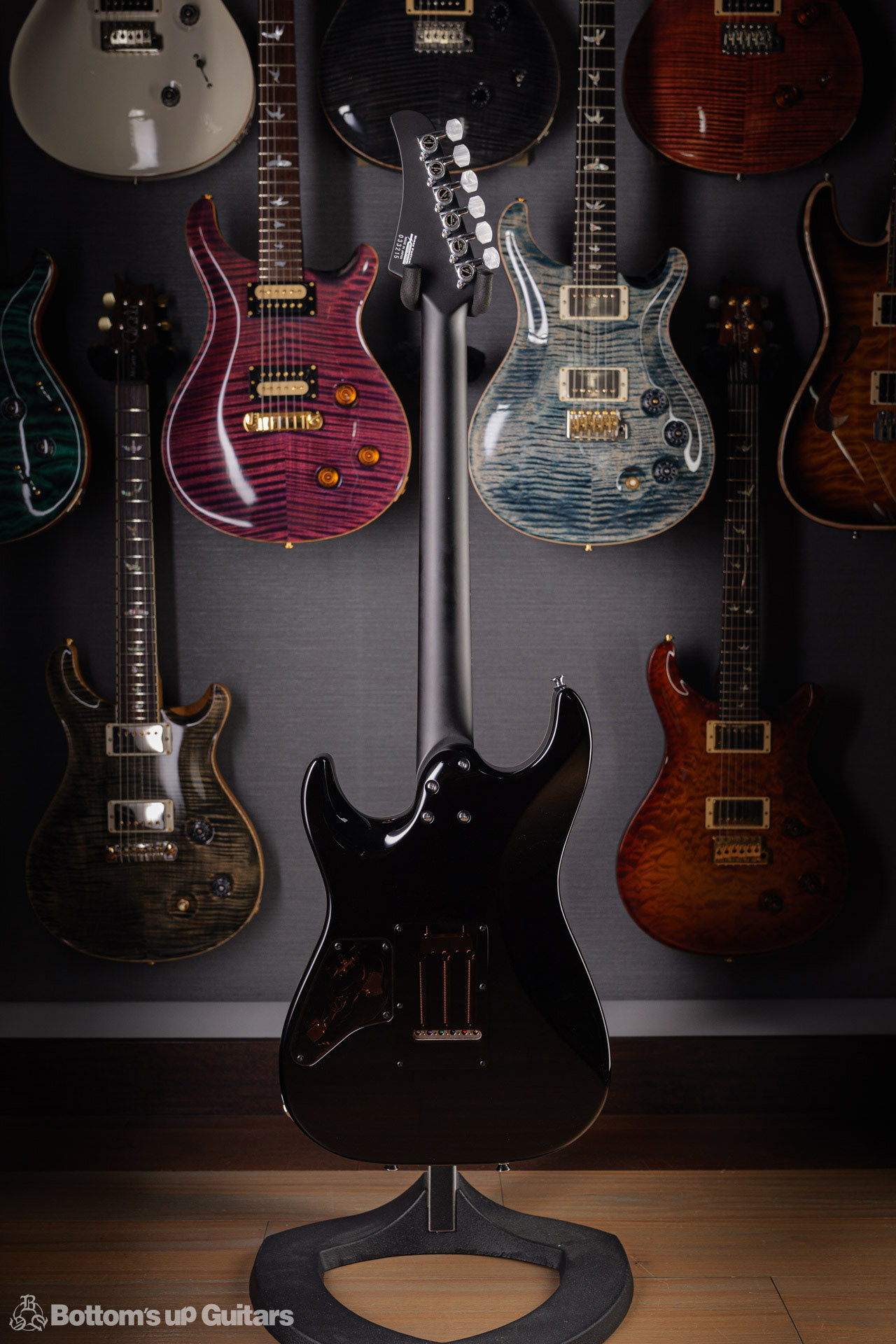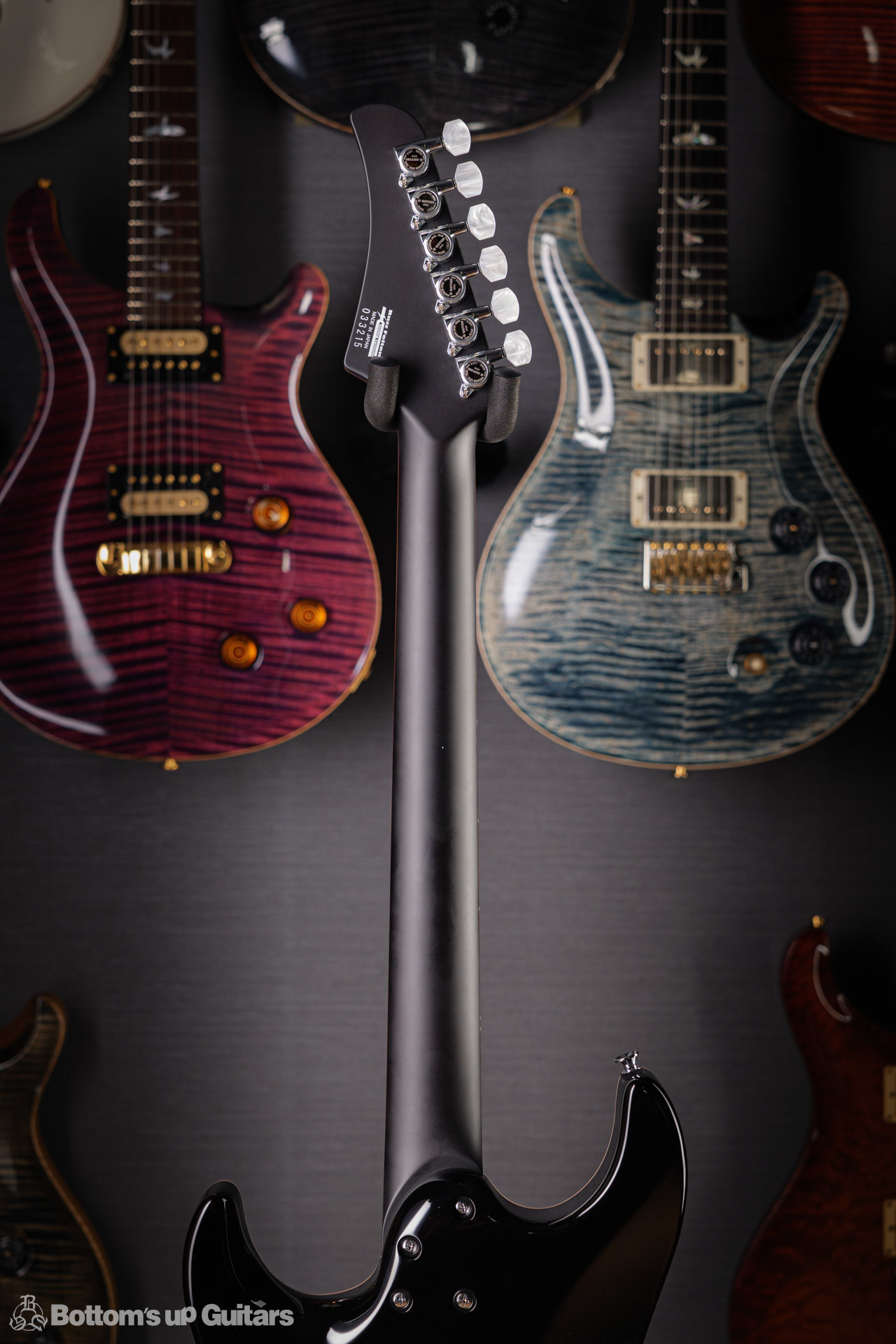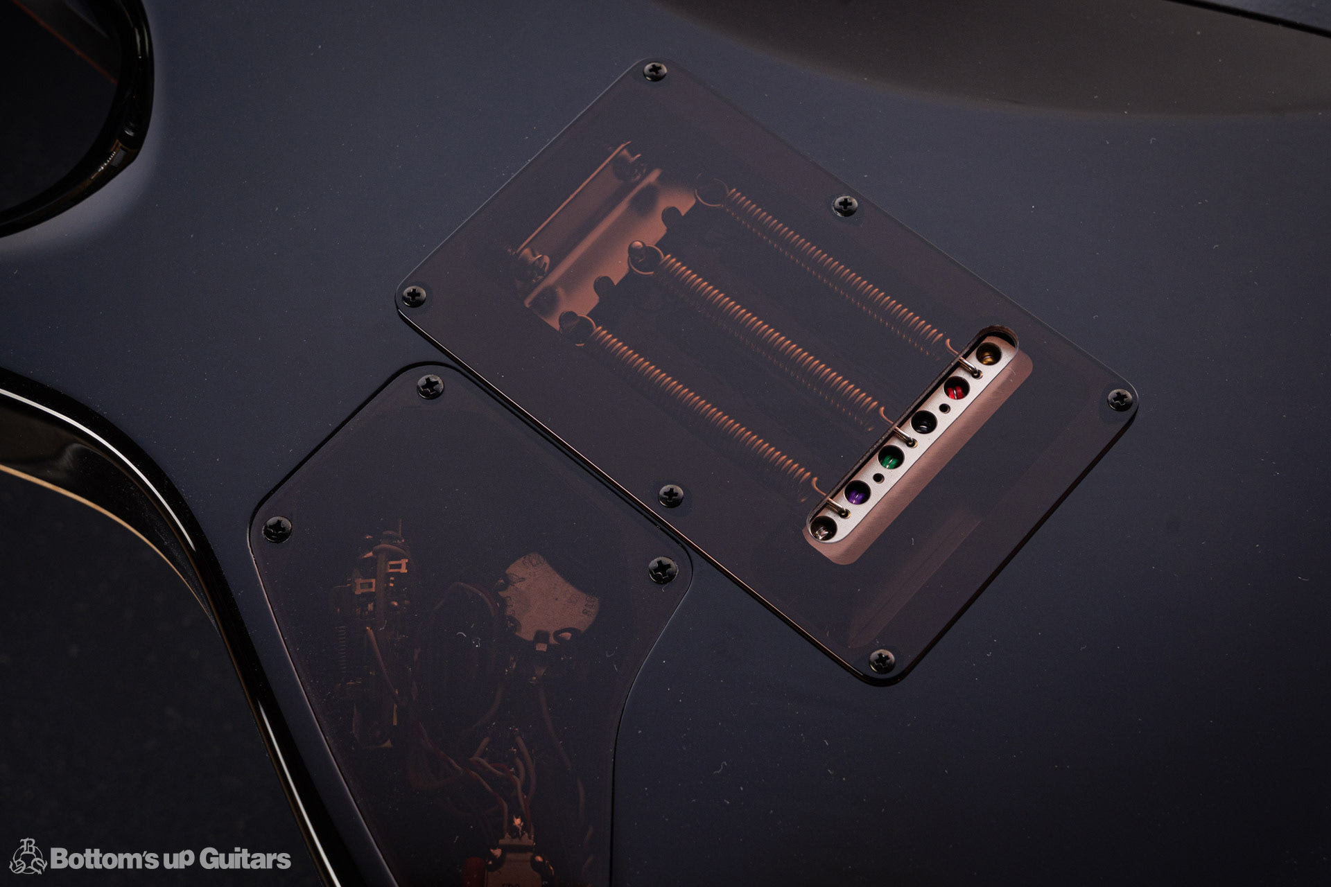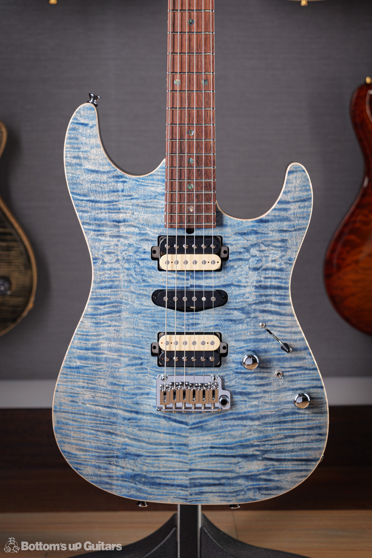 T's Guitars ( ティーズギター ) カスタムモデル - Trans Blue Denim Finish - フリーダム(F.C.G.R)社製のステンレスフレット、ルミンレイ(強蓄光)のサイドドットポジションマークを採用し、ジョイントプレートを排したラウンドヒール加工。 ⇒ プロの現場でも即活躍できて、永く良いコンディションで弾き続けて頂けるように致しました。 バックパネルが透けていたり、ボディエンド側のエンドピンを2個つけていたりする点もB.U.G.ならではのこだわりです。